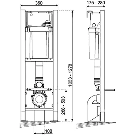Hauteur réglable de 1063 à 1278 mm, largeur 360 mm et profondeur entre 175 à 280 mm connexion en eau sur robinet d’arrêt à l’intérieur du réservoir.