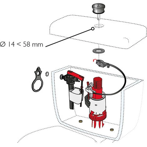 Mécanisme, bouton poussoir, joint de clapet, joint de culot, joint de cuvette, écrou, kit de vissage, clé de serrage