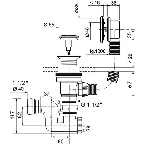 Ensemble de trop plein L1300, siphon orientable, adaptateur 40/43, corps de bonde quick clac, joint de bonde, clapet inox, notice