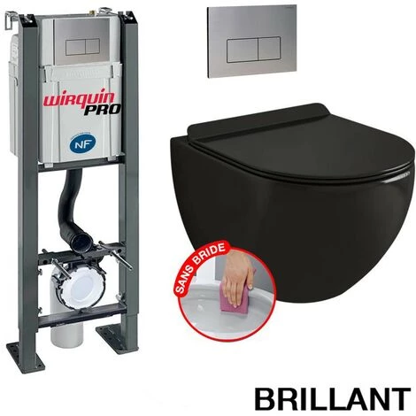 Pack Complet WC Sans Bride Bati Autoportant + Cuvette Noir Brillant sans bride + Plaque Inox DESIGN WC suspendu compact en céramique blanche au design moderne et contemporain.