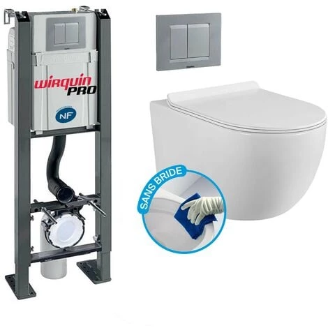 Pack Complet WC Sans Bride Bati Autoportant + Cuvette + Plaque Chromée modele CHRONO WC suspendu compact en céramique blanche au design moderne et contemporain.