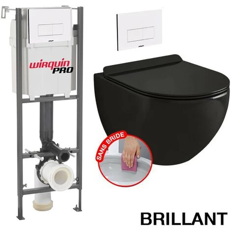 Pack Complet WC Sans Bride Bati INITIO + Cuvette noir brillant suspendu sans bride + Plaque Blanche DESIGN