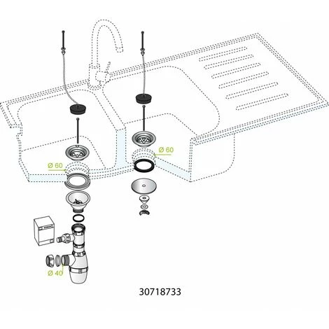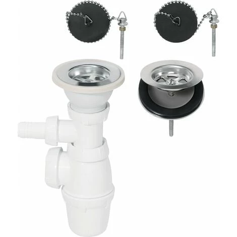Vidage pour évier Ø 60 mm 2 bacs communicants (grès ou synthèse), siphon réglable en hauteur, avec prise machine à laver, 2 bondes à bouchon dont 1 avec plaque d’obturation.