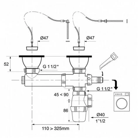- Caractéristiques: Siphon réglable, Trop plein, Deux bacs, Sortie machine à laver